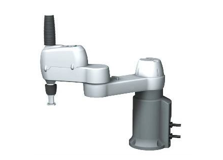 水平多关节工业机器人,包括底座,底座上设置有下臂,下臂上设置有上臂,上臂的右侧设置有驱动电机、主动带轮、从动带轮、花键轴、谐波减速机以及传动轴,驱动电机竖直设置在主动带轮的上方,主动带轮在驱动电机的驱动下进行转动,从动带轮设置在主动带轮的右侧并通过同步带与主动带轮同步转动,从动带轮的中心竖直设置有传动轴,传动轴贯穿从动带轮且向下延伸形成延伸部,谐波减速机设置在传动轴的延伸部上,传动轴的中心设置有花键轴,花键轴贯穿谐波减速机并向外延伸,谐波减速机通过花键母与传动轴固定连接。